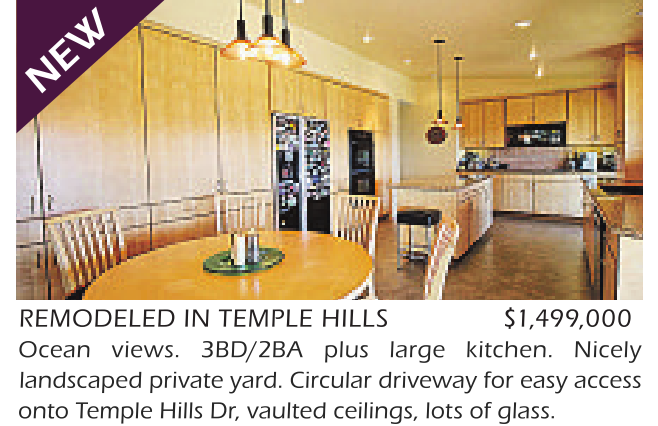 REMODELED IN TEMPLE HILLS $1,499,000 Ocean views. 3BD/2BA plus large kitchen. Nicely landscaped private yard. Circular driveway for easy access onto Temple Hills Dr, vaulted ceilings, lots of glass.