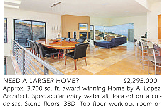 NEED A LARGER HOME? $2,295,000 Approx. 3,700 sq. ft. award winning Home by Al Lopez Architect. Spectacular entry waterfall, located on a culde-sac. Stone floors, 3BD. Top floor work-out room or