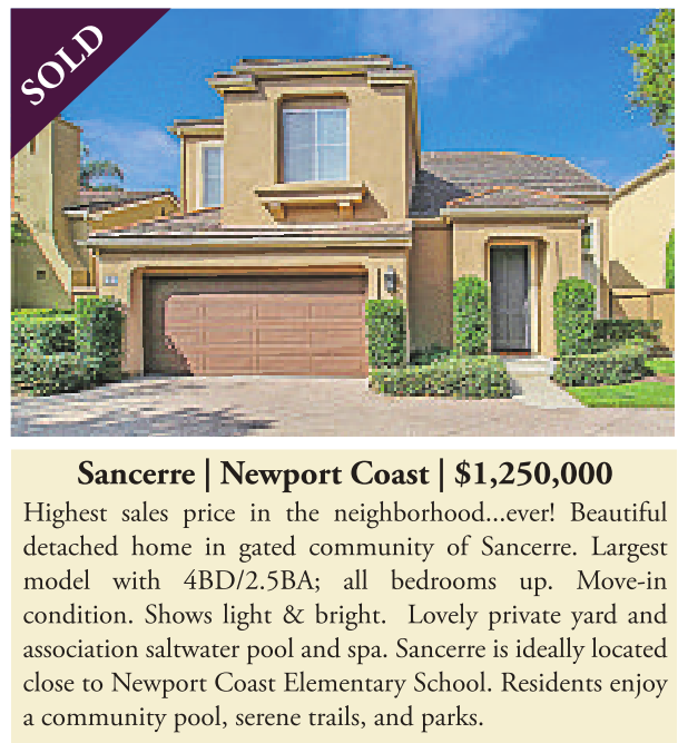Sancerre | Newport Coast | $1,250,000 Highest sales price in the neighborhood...ever! Beautiful detached home in gated community of Sancerre. Largest model with 4BD/2.5BA; all bedrooms up. Move-in condition. Shows light & bright. Lovely private yard and association saltwater pool and spa. Sancerre is ideally located close to Newport Coast Elementary School. Residents enjoy a community pool, serene trails, and parks.
