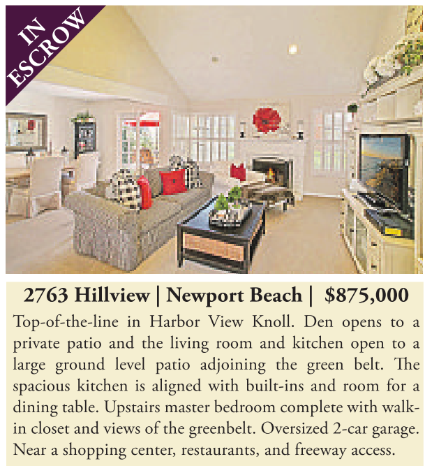 2763 Hillview | Newport Beach | $875,000 Top-of-the-line in Harbor View Knoll. Den opens to a private patio and the living room and kitchen open to a large ground level patio adjoining the green belt. The spacious kitchen is aligned with built-ins and room for a dining table. Upstairs master bedroom complete with walkin closet and views of the greenbelt. Oversized 2-car garage. Near a shopping center, restaurants, and freeway access.