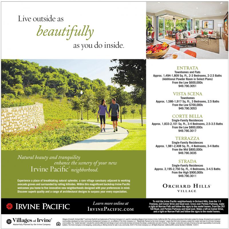 Villages of Irvine®,Orchard Hills™ and Irvine Pacific® are trademarks ofThe Irvine CompanyLLC,used for marketing villages of new homes in Irvine,California USA.Plan,pricing,and product information subject to change.Allprojectsare in planned communities developed by Irvine Community Development CompanyLLC,anaffiliate of The Irvine CompanyLLC.“Masterfully Planned by the Irvine Company” means thatthe Irvine Companycreated themaster land plan for all Irvine Company communities.The “master land plan” includes the overall entitlement and design of each community but does not include the design,construction and sale of homes.The design, construction and sale of homes is the sole responsibility of community builders.The Irvine Companyisnot designing, constructing or offering homes for sale in anycommunity.©2014 The Irvine CompanyLLC.All Rights Reserved. California BRE License Number 01889266. 10/2014