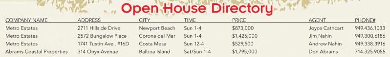 COMPANY NAME ADDRESS CITY TIME PRICE AGENT PHONE# Metro Estates 2711 Hillside Drive Newport Beach Sun 1-4 $873,000 Joyce Cathcart 949.436.1033 Metro Estates 2572 Bungalow Place Corona del Mar Sun 1-4 $1,425,000 Jim Nahin 949.300.6186 Metro Estates 1741 Tustin Ave., #16D Costa Mesa Sun 12-4 $529,500 Andrew Nahin 949.338.3916 Abrams Coastal Properties 314 Onyx Avenue Balboa Island Sat/Sun 1-4 $1,795,000 Don Abrams 714.325.9055