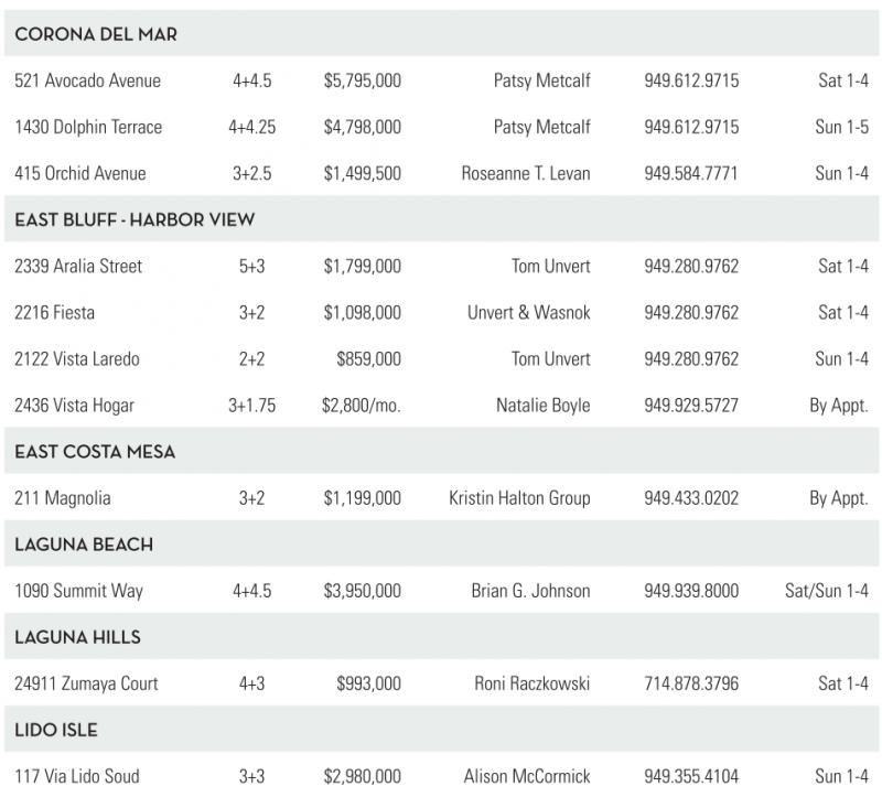 CORONA DELMAR 521 Avocado Avenue 4+4.5 $5,795,000 Patsy Metcalf 949.612.9715 Sat 1-4 1430 Dolphin Terrace 4+4.25 $4,798,000 Patsy Metcalf 949.612.9715 Sun 1-5 415 Orchid Avenue 3+2.5 $1,499,500 Roseanne T. Levan 949.584.7771 Sun 1-4 EASTBLUFF -HARBOR VIEW 2339 Aralia Street 5+3 $1,799,000 TomUnvert 949.280.9762 Sat 1-4 2216 Fiesta 3+2 $1,098,000 Unvert &Wasnok 949.280.9762 Sat 1-4 2122 VistaLaredo 2+2 $859,000 TomUnvert 949.280.9762 Sun 1-4 2436 VistaHogar 3+1.75 $2,800/mo. Natalie Boyle 949.929.5727 By Appt. EASTCOSTA MESA 211 Magnolia 3+2 $1,199,000 Kristin Halton Group 949.433.0202 By Appt. GUNA BEACH 1090 Summit Way 4+4.5 $3,950,000 Brian G. Johnson 949.939.8000 Sat/Sun 1-4 GUNA HILLS 24911 Zumaya Court 4+3 $993,000 Roni Raczkowski 714.878.3796 Sat 1-4 LIDO ISLE 117 ViaLidoSoud 3+3 $2,980,000 Alison McCormick 949.355.4104 Sun 1-4