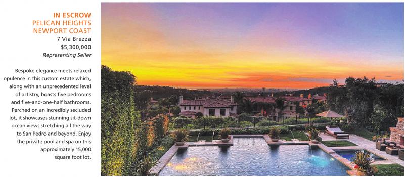 IN ESCROW PELICAN HEIGHTS NEWPORT COAST 7 Via Brezza $5,300,000 Representing Seller Bespoke elegance meets relaxed opulence in this custom estate which, along with an unprecedented level of artistry, boasts five bedrooms and five-and-one-half bathrooms. Perched on an incredibly secluded lot, it showcases stunning sit-down ocean views stretching all the way to San Pedro and beyond. Enjoy the private pool and spa on this approximately 15,000 square foot lot.