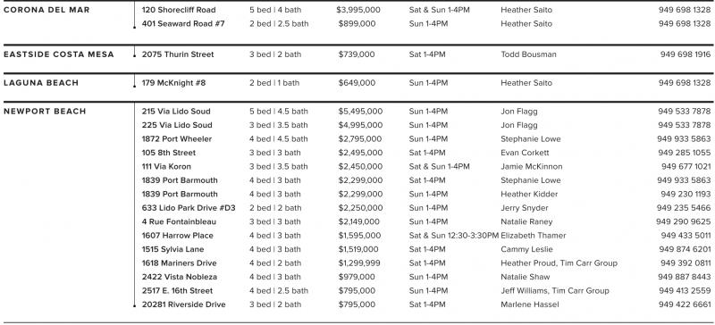 NEWPORT BEACH 215 Via Lido Soud 5 bed | 4.5 bath $5,495,000 Sun 1-4PM Jon Flagg 949 533 7878 225 Via Lido Soud 3 bed | 3.5 bath $4,995,000 Sun 1-4PM Jon Flagg 949 533 7878 1872 Port Wheeler 4 bed | 4.5 bath $2,795,000 Sun 1-4PM Stephanie Lowe 949 933 5863 105 8th Street 3 bed | 3 bath $2,495,000 Sat 1-4PM Evan Corkett 949 285 1055 111 Via Koron 3 bed | 3.5 bath $2,450,000 Sat & Sun 1-4PM Jamie McKinnon 949 677 1021 1839 Port Barmouth 4 bed | 3 bath $2,299,000 Sat 1-4PM Stephanie Lowe 949 933 5863 1839 Port Barmouth 4 bed | 3 bath $2,299,000 Sun 1-4PM Heather Kidder 949 230 1193 633 Lido Park Drive #D3 2 bed | 2 bath $2,250,000 Sun 1-4PM Jerry Snyder 949 235 5466 4 Rue Fontainbleau 3 bed | 3 bath $2,149,000 Sun 1-4PM Natalie Raney 949 290 9625 1607 Harrow Place 4 bed | 3 bath $1,595,000 Sat & Sun 12:30-3:30PM Elizabeth Thamer 949 433 5011 1515 Sylvia Lane 4 bed | 3 bath $1,519,000 Sat 1-4PM Cammy Leslie 949 874 6201 1618 Mariners Drive 4 bed | 2 bath $1,299,999 Sat 1-4PM Heather Proud, Tim Carr Group 949 392 0811 2422 Vista Nobleza 4 bed | 3 bath $979,000 Sun 1-4PM Natalie Shaw 949 887 8443 2517 E. 16th Street 4 bed | 2.5 bath $795,000 Sun 1-4PM Jeff Williams, Tim Carr Group 949 413 2559 20281 Riverside Drive 3 bed | 2 bath $795,000 Sat 1-4PM Marlene Hassel 949 422 6661