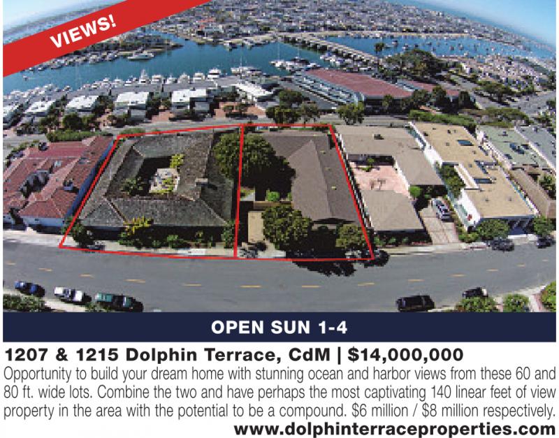 OPEN SUN 1-4 1207 & 1215 Dolphin Terrace, CdM | $14,000,000 Opportunity to build your dream home with stunning ocean and harbor views from these 60 and 80 ft. wide lots. Combine the two and have perhaps the most captivating 140 linear feet of view property in the area with the potential to be a compound. $6 million / $8 million respectively. www.dolphinterraceproperties.com See also