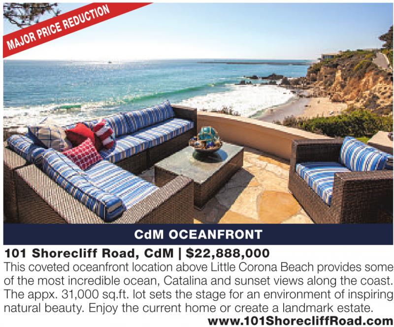 101 Shorecliff Road, CdM | $22,888,000 This coveted oceanfront location above Little Corona Beach provides some of the most incredible ocean, Catalina and sunset views along the coast. The appx. 31,000 sq.ft. lot sets the stage for an environment of inspiring natural beauty. Enjoy the current home or create a landmark estate. CdM OCEANFRONT www.101ShorecliffRoad.com