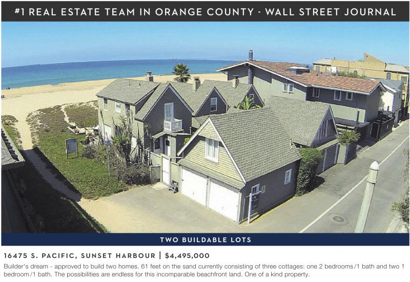# 1 R E A L E STAT E T E A M I N O RA N G E CO U N T Y - WA L L ST R E E T J O U R N A L TWO BUILDABLE LOTS 16475 S. PACIFIC, SUNSET HARBOUR | $4,495,000 Builder's dream - approved to build two homes. 61 feet on the sand currently consisting of three cottages: one 2 bedrooms/1 bath and two 1 bedroom/1 bath. The possibilities are endless for this incomparable beachfront land. One of a kind property.