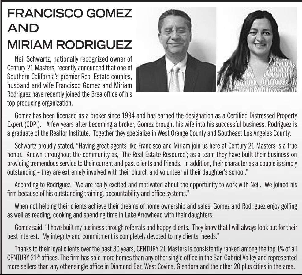Neil Schwartz, nationally recognized owner of Century21Masters, recentlyannounced that oneof Southern California’s premier Real Estate couples, husband and wife Francisco Gomez and Miriam Rodriguez have recentlyjoinedthe Brea officeofhis topproducing organization.