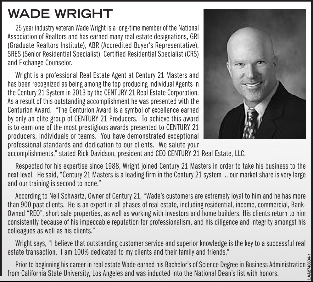 According to Neil Schwartz, Owner of Century 21, “Wade’s customers are extremely loyal to him and he has more than 900 past clients. He is an expert in all phases of real estate, including residential, income, commercial, Bank- Owned “REO”, short sale properties, as well as working with investors and home builders. His clients return to him consistently because of his impeccable reputation for professionalism, and his diligence and integrity amongst his colleagues as well as his clients.”