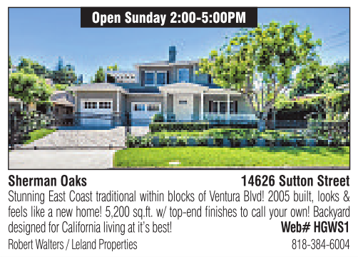 Open Sunday 2:00-5:00PM Sherman Oaks 14626 Sutton Street Stunning East Coast traditional within blocks of Ventura Blvd! 2005 built, looks & feels like anew home! 5,200 sq.ft. w/ top-end finishes to call your own! Backyard designed for California living at it’s best! Web# HGWS1 RobertWalters /Leland Properties 818-384-6004