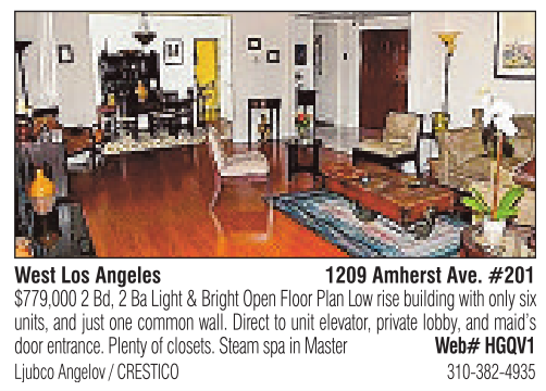 West Los Angeles 1209 Amherst Ave. #201 $779,000 2Bd, 2BaLight &Bright Open Floor Plan Lowrise building with only six units, and just one common wall. Direct to unit elevator,private lobby,and maid’s door entrance. Plenty of closets. Steam spa in Master Web# HGQV1 Ljubco Angelov /CRESTICO 310-382-4935