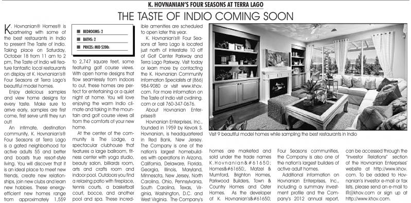 K. Hovnanian’s® Four Seasons at Terra Lago is located just north of Interstate 10 off of Golf Center Parkway and Terra Lago Parkway. Visit today or learn more by contacting the K. Hovnanian Community Information Specialists at (866) 984-9080 or visit www.khov. com. For more information on The Taste of Indio visit cvdining. com or call 760-347-0676.