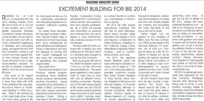 BIS 2014 is generously sponsored and supported by the gas Company, iMortgage, Sub-Zero Wolf, Peninsula Publishing and its family of publications including Builder &Developer, green Home Builder and Options magazines, fusion Sign, temeka group and Steve Wolff & Associates.