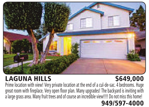LAGUNA HILLS $649,000 Prime location with view! Very private location at the end of acul-de-sac. 4bedrooms. Huge great room with fireplace. Very open floor plan. Many upgrades! The backyard is inviting with alarge grassarea. Manyfruit trees andofcourse an incredible view!!!! Do notmissthis home! 949/597-4000