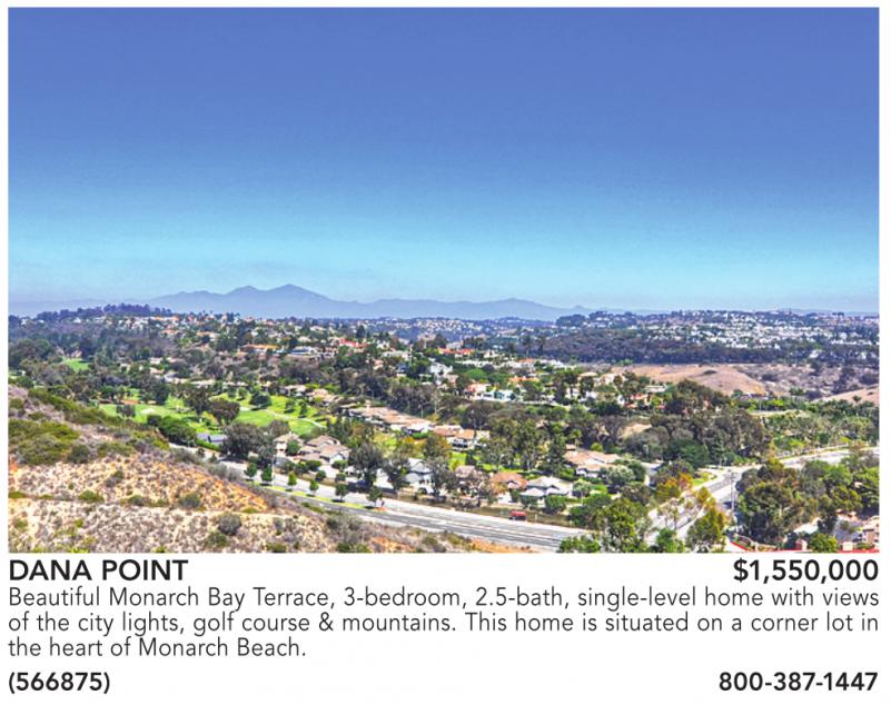 DANA POINT $1,550,000 Beautiful Monarch Bay Terrace, 3-bedroom, 2.5-bath, single-level home with views of the city lights, golf course & mountains. This home is situated on a corner lot in the heart of Monarch Beach.