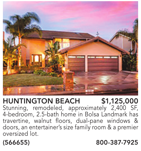 HUNTINGTON BEACH $1,125,000 Stunning, remodeled, approximately 2,400 SF, 4-bedroom, 2.5-bath home in Bolsa Landmark has travertine, walnut floors, dual-pane windows & doors, an entertainer’s size family room &apremier oversized lot. (566655) 800-387-7925