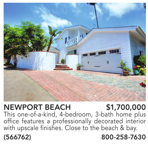 NEWPORT BEACH $1,700,000 This one-of-a-kind, 4-bedroom, 3-bath home plus office features a professionally decorated interior with upscale finishes. Close to the beach & bay.
