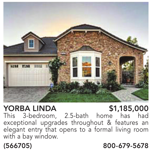 YORBA LINDA $1,185,000 This 3-bedroom, 2.5-bath home has had exceptional upgrades throughout & features an elegant entry that opens to a formal living room with a bay window. (566705) 800-679-5678