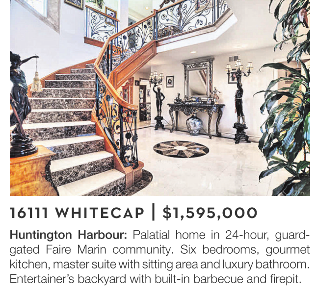 Huntington Harbour: Palatial home in 24-hour, guardgated Faire Marin community. Six bedrooms, gourmet kitchen, master suite with sitting area and luxury bathroom. Entertainer’s backyard with built-in barbecue and firepit.