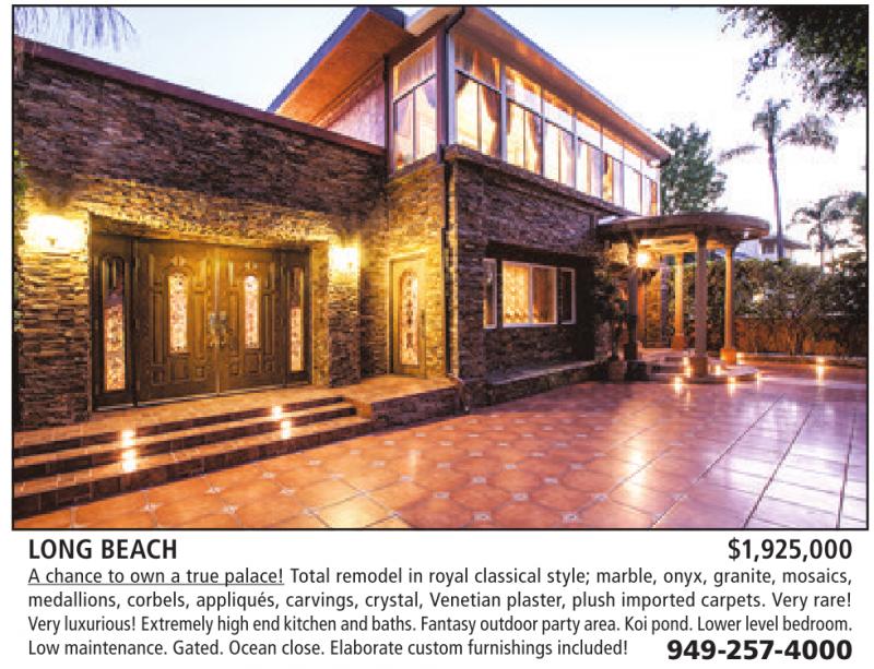 LONG BEACH $1,925,000 A chance to own a true palace! Total remodel in royal classical style; marble, onyx, granite, mosaics, medallions, corbels, appliqués, carvings, crystal, Venetian plaster, plush imported carpets. Very rare! Very luxurious!Extremely high end kitchen andbaths.Fantasy outdoorparty area.Koi pond.Lowerlevel bedroom. Lowmaintenance. Gated. Ocean close.Elaboratecustomfurnishings included! 949-257-4000