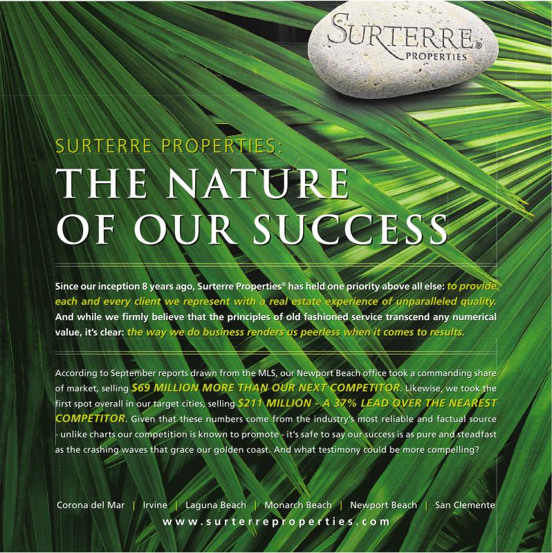 S U R T E R R E P R O P E R T I E S : T H E N AT U R E O F O U R S U C C E S S Since our inception 8 years ago, Surterre Properties ® has held one priority above all else: to provide each and every client we represent with a real estate experience of unparalleled quality. And while we firmly believe that the principles of old fashioned service transcend any numerical value, it’s clear: the way we do business renders us peerless when it comes to results. According to September reports drawn from the MLS, our Newport Beach office took a commanding share of market, selling $69 MILLION MORE THAN OUR NEXT COMPETITOR. Likewise, we took the first spot overall in our target cities, selling $211 MILLION - A 37% LEAD OVER THE NEAREST COMPETITOR. Given that these numbers come from the industry’s most reliable and factual source - unlike charts our competition is known to promote - it’s safe to say our success is as pure and steadfast as the crashing waves that grace our golden coast. And what testimony could be more compelling? Corona del Mar | Irvine | Laguna Beach | Monarch Beach | Newport Beach | San Clemente w w w . s u r t e r r e p r o p e r t i e s . c o m
