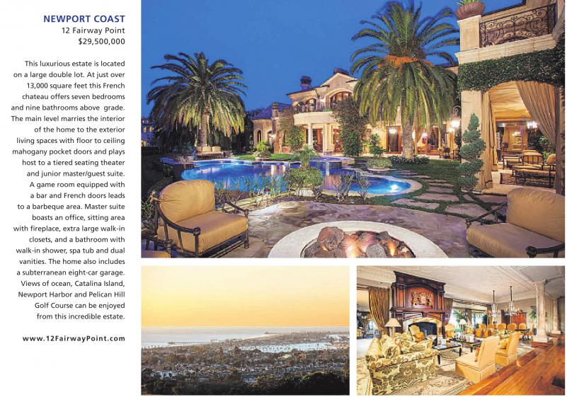 NEWPORT COAST 12 Fairway Point $29,500,000 This luxurious estate is located on a large double lot. At just over 13,000 square feet this French chateau offers seven bedrooms and nine bathrooms above grade. The main level marries the interior of the home to the exterior living spaces with floor to ceiling mahogany pocket doors and plays host to a tiered seating theater and junior master/guest suite. A game room equipped with a bar and French doors leads to a barbeque area. Master suite boasts an office, sitting area with fireplace, extra large walk-in closets, and a bathroom with walk-in shower, spa tub and dual vanities. The home also includes a subterranean eight-car garage. Views of ocean, Catalina Island, Newport Harbor and Pelican Hill Golf Course can be enjoyed from this incredible estate. www.12FairwayPoint.com