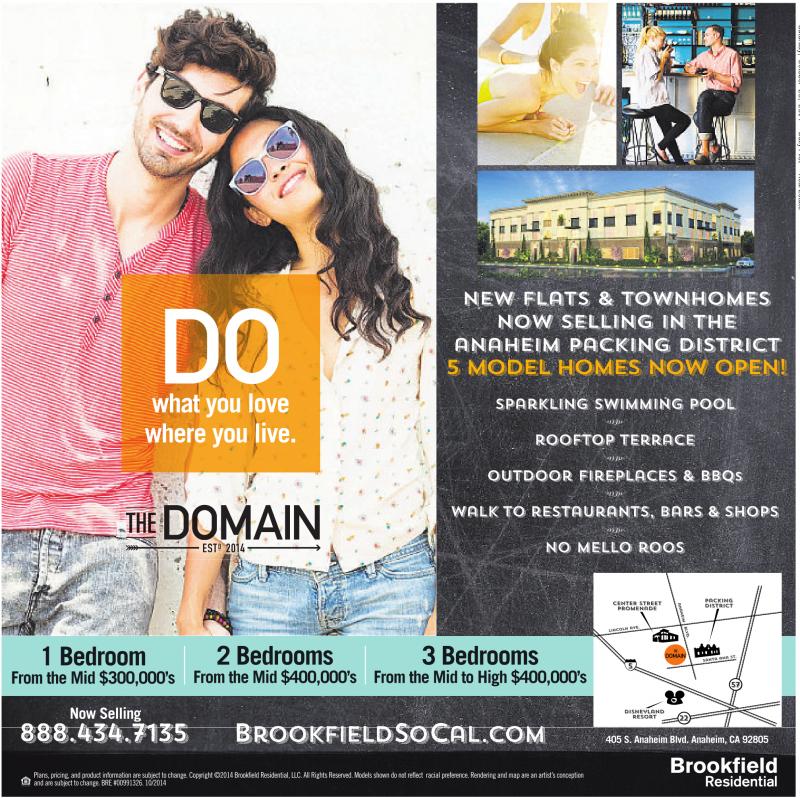 what you love where you live. new flats & townhomes now selling in the anaheim packing district 5 model homes now open! Sparkling swimming pool rooftop terrace outdoor fireplaces & bbqs walk to restaurants, bars & shops no mello roos CENTER STREET promenade packing district 1 Bedroom From the Mid $300,000’s 2 Bedrooms From the Mid $400,000’s 3 Bedrooms From the Mid to High $400,000’s 5 57 Now Selling 888.434.7135 brookfieldsocal.com Disneyland resort 22 405 S. Anaheim Blvd. Anaheim, CA 92805 Plans, pricing, and product information are subject to change. Copyright ©2014 Brookfield Residential, LLC. All Rights Reserved. Models shown do not reflect racial preference. Rendering and map are an artist’sconception and are subject to change. BRE #00991326. 10/2014