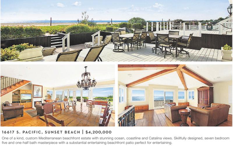 16617 S. PACIFIC, SUNSET BEACH | $4,200,000 One of a kind, custom Mediterranean beachfront estate with stunning ocean, coastline and Catalina views. Skillfully designed, seven bedroom five and one-half bath masterpiece with a substantial entertaining beachfront patio perfect for entertaining.