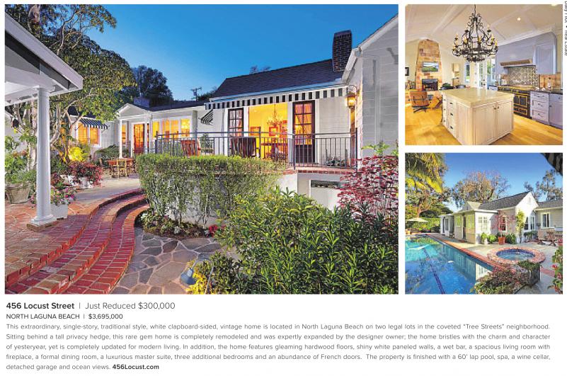 456 Locust Street | Just Reduced $300,000 NORTH LAGUNA BEACH | $3,695,000 This extraordinary, single-story, traditional style, white clapboard-sided, vintage home is located in North Laguna Beach on two legal lots in the coveted “Tree Streets” neighborhood. Sitting behind a tall privacy hedge, this rare gem home is completely remodeled and was expertly expanded by the designer owner; the home bristles with the charm and character detached garage and ocean views. 456Locust.com