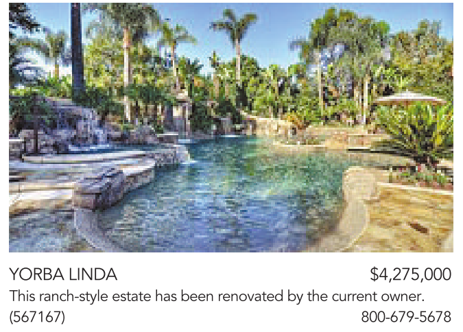 YORBA LINDA $4,275,000 This ranch-style estate has been renovated by the current owner. (567167) 800-679-5678