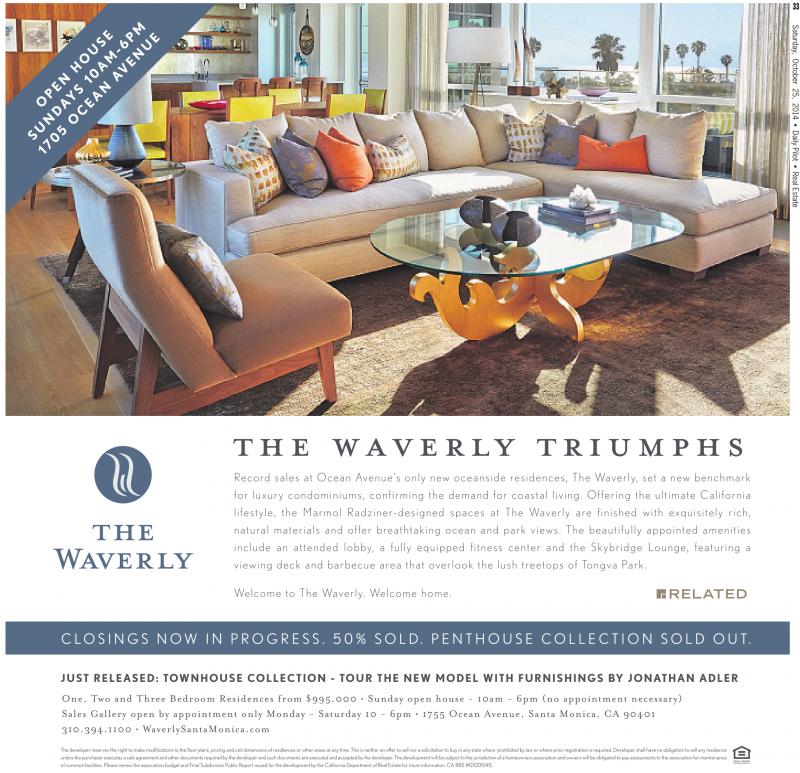 33 T H E W A V E R L Y T R I U M P H S Record sales at Ocean Avenue’s only new oceanside residences, The Waverly, set a new benchmark for luxury condominiums, confirming the demand for coastal living. Offering the ultimate California lifestyle, the Marmol Radziner-designed spaces at The Waverly are finished with exquisitely rich, natural materials and offer breathtaking ocean and park views. The beautifully appointed amenities include an attended lobby, a fully equipped fitness center and the Skybridge Lounge, featuring a viewing deck and barbecue area that overlook the lush treetops of Tongva Park. Welcome to The Waverly. Welcome home. C LO S I N G S N O W I N P R O G R E S S . 5 0 % S O L D. P E N T H O U S E C O L L E C T I O N S O L D O U T. JUST RELEASED: TOWNHOUSE COLLECTION - TOUR THE NEW MODEL WITH FURNISHINGS BY JONATHAN ADLER One, Two and Three Bedroom Residences from $995,000 • Sunday open house - 10am - 6pm (no appointment necessary) Sales Gallery open by appointment only Monday - Saturday 10 - 6pm • 1755 Ocean Avenue, Santa Monica, CA 90401 310.394.1100 • WaverlySantaMonica.com The developer reservesthe right to makemodifications to the floor plans, pricing and unit dimensions of residences or other areas at any time. This is neither an offer to sell nor asolicitation to buy in any state where prohibited by law or whereprior registration is required. Developer shall havenoobligation to sell any residence unlessthe purchaser executes asale agreement and other documents required by the developer and such documents areexecuted andaccepted by the developer.The development will be subject to the jurisdiction of ahomeowners association and owners will be obligated to pay assessments to the association for maintenance of common facilities. Please reviewthe association budget and Final Subdivision Public Reportissued for the development by theCalifornia Department of Real Estate for moreinformation. CA BRE #01005145.