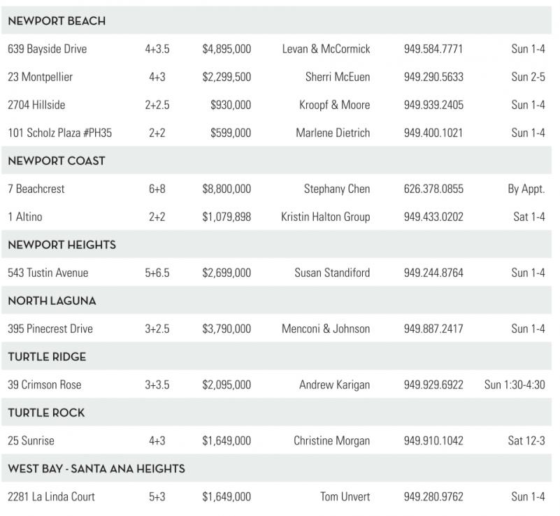 NEWPORTBEACH 639 Bayside Drive 4+3.5 $4,895,000 Levan &McCormick 949.584.7771 Sun 1-4 23 Montpellier 4+3 $2,299,500 Sherri McEuen 949.290.5633 Sun 2-5 2704 Hillside 2+2.5 $930,000 Kroopf &Moore 949.939.2405 Sun 1-4 101 Scholz Plaza #PH35 2+2 $599,000 Marlene Dietrich 949.400.1021 Sun 1-4 NEWPORTCOAST 7Beachcrest 6+8 $8,800,000 Stephany Chen 626.378.0855 By Appt. 1Altino 2+2 $1,079,898 Kristin Halton Group 949.433.0202 Sat 1-4 NEWPORTHEIGHTS 543 Tustin Avenue 5+6.5 $2,699,000 Susan Standiford 949.244.8764 Sun 1-4 NORTH GUNA 395 Pinecrest Drive 3+2.5 $3,790,000 Menconi &Johnson 949.887.2417 Sun 1-4 TURTLE RIDGE 39 Crimson Rose 3+3.5 $2,095,000 Andrew Karigan 949.929.6922 Sun 1:30-4:30 TURTLE ROCK 25 Sunrise 4+3 $1,649,000 Christine Morgan 949.910.1042 Sat 12-3 WESTBAY -SANTAANA HEIGHTS 2281 La Linda Court 5+3 $1,649,000 TomUnvert 949.280.9762 Sun 1-4