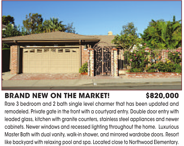 BRAND NEW ON THE MARKET! $820,000 Rare 3bedroom and 2bath single level charmer that has been updated and remodeled. Private gate inthe front with acourtyard entry. Double door entry with leaded glass, kitchen with granite counters, stainless steel appliances and newer cabinets. Newer windows and recessed lighting throughout the home. Luxurious Master Bath with dual vanity, walk-in shower, and mirrored wardrobe doors. Resort like backyard with relaxing pool and spa. Located close to Northwood Elementary.