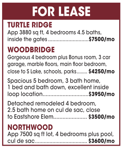 FOR LEASE TURTLE RIDGE App 3880 sq ft, 4bedrooms 4.5 baths, inside the gates ............................$7500/mo WOODBRIDGE Gorgeous 4bedroom plus Bonus room, 3car garage, marble floors, main floor bedroom, close to SLake, schools, parks........ $4250/mo Spacious 5bedroom, 3bath home, 1bed and bath down, excellent inside loop location..............................$3950/mo Detached remodeled 4bedroom, 2.5 bath home on cul desac, close to Eastshore Elem...................... $3500/mo NORTHWOOD App 7500 sq ft lot, 4bedrooms plus pool, cul desac.................................... $3600/mo