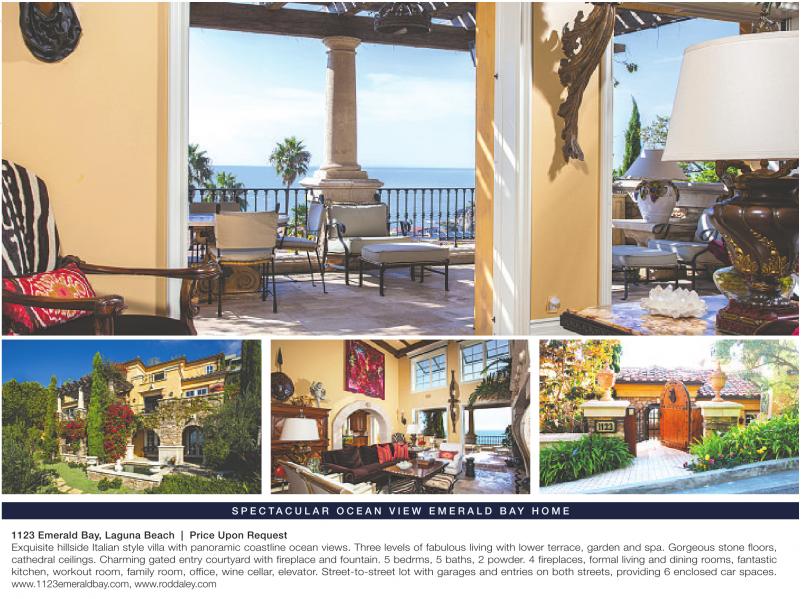 S P E C TA C U L A R O C E A N V I E W E M E R A L D B AY H O M E 1123 Emerald Bay, Laguna Beach | Price Upon Request Exquisite hillside Italian style villa with panoramic coastline ocean views. Three levels of fabulous living with lower terrace, garden and spa. Gorgeous stone floors, cathedral ceilings. Charming gated entry courtyard with fireplace and fountain. 5 bedrms, 5 baths, 2 powder. 4 fireplaces, formal living and dining rooms, fantastic kitchen, workout room, family room, office, wine cellar, elevator. Street-to-street lot with garages and entries on both streets, providing 6 enclosed car spaces. www.1123emeraldbay.com, www.roddaley.com