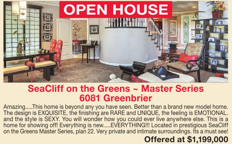 OPEN HOUSE SeaCliff on the Greens ~ Master Series 6081 Greenbrier Amazing.....This home is beyond any you have seen. Better than a brand new model home. The design is EXQUISITE, the finishing are RARE and UNIQUE, the feeling is EMOTIONAL. and the style is SEXY. You will wonder how you could ever live anywhere else. This is ahome for showing off! Everything is new.....EVERYTHING!!! Located in prestigious SeaCliff on theGreensMasterSeries, plan 22.Veryprivate andintimatesurroundings.Its amust see! Offered at $1,199,000 See also