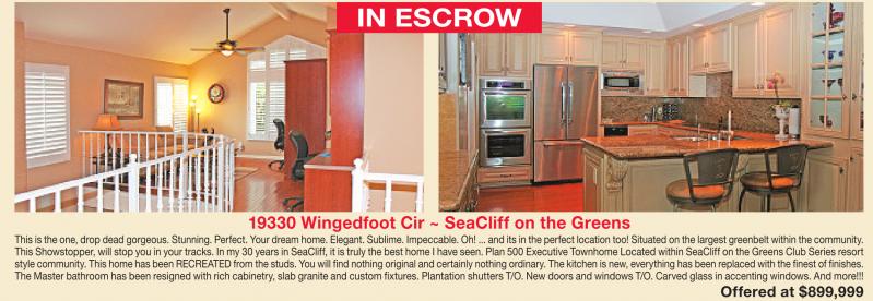 IN ESCROW 19330 Wingedfoot Cir ~ SeaCliff on the Greens This is theone,dropdeadgorgeous. Stunning. Perfect. Your dream home.Elegant. Sublime. Impeccable. Oh!... andits in theperfect location too! Situated on thelargest greenbeltwithin thecommunity. This Showstopper, will stop youinyourtracks. In my 30 yearsinSeaCliff, it is trulythe best home Ihaveseen. Plan 500Executive Townhome Locatedwithin SeaCliff on theGreensClubSeriesresort stylecommunity. This home hasbeenRECREATED from thestuds.You will findnothingoriginal and certainlynothingordinary. Thekitchen is new, everythinghas been replaced with thefinest of finishes. TheMasterbathroomhas been resignedwithrichcabinetry,slabgraniteand custom fixtures. Plantation shutters T/O. Newdoorsand windows T/O. Carved glassinaccenting windows.And more!!! Offered at $899,999