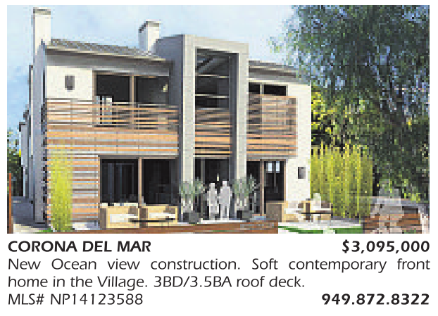 CORONA DEL MAR $3,095,000 New Ocean view construction. Soft contemporary front home in the Village. 3BD/3.5BA roof deck. MLS# NP14123588 949.872.8322
