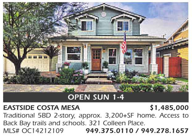 EASTSIDE COSTA MESA $1,485,000 Traditional 5BD 2-story, approx. 3,200+SF home. Access to Back Bay trails and schools. 321 Colleen Place. MLS# OC14212109 949.375.0110 / 949.278.1657