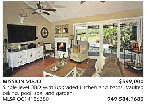 MISSION VIEJO $599,000 Single level 3BD with upgraded kitchen and baths. Vaulted ceiling, pool, spa, and garden. MLS# OC14186380 949.584.1680