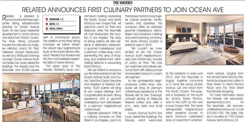 planned for Ocean Avenue South, its new luxury residential development in Santa Monica one block from Pacific Ocean. The three dining concepts include the beloved Los Angeles institution Joan’s On Third, Hakkasan Group’s Searsucker, as well as a Starbucks Evenings concept. Ocean Avenue South comprises two luxury residential buildings, The Waverly and The Seychelle, and 20,000 square