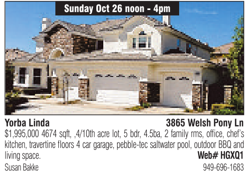 Yorba Linda Sunday Oct 26 noon -4pm 3865 Welsh Pony Ln Susan Bakke 949-696-1683 $1,995,000 4674 sqft, ,4/10th acre lot, 5bdr, 4.5ba, 2family rms, office, chef’s kitchen, travertine floors 4car garage, pebble-tec saltwater pool, outdoor BBQ and living space. Web# HGXQ1