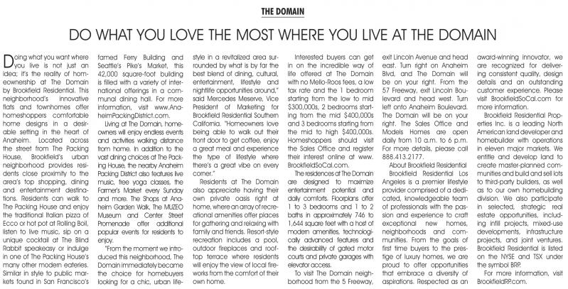 Interested buyers can get in on the incredible way of life offered at The Domain with no Mello-Roos fees, a low tax rate and the 1 bedroom starting from the low to mid $300,000s, 2 bedrooms starting from the mid $400,000s and 3 bedrooms starting from the mid to high $400,000s. Homeshoppers should visit the Sales office and register their interest online at www. BrookfieldSoCal.com.