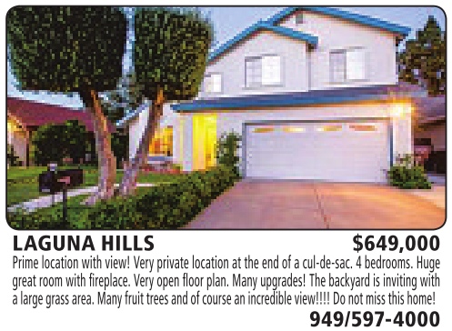 LAGUNA HILLS $649,000 Prime location with view! Very private location at the end of acul-de-sac. 4bedrooms. Huge great room with fireplace. Very open floor plan. Many upgrades! The backyard is inviting with alarge grassarea. Manyfruit trees andofcourse an incredible view!!!! Do notmissthis home! 949/597-4000