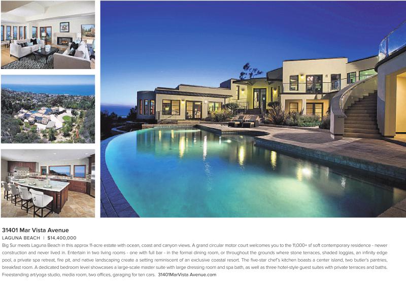 31401 Mar Vista Avenue LAGUNA BEACH | $14,400,000 BigSur meets LagunaBeach in this approx11-acre estatewithocean, coast and canyon views.Agrand circularmotor court welcomesyou to the 11,000+ sf soft contemporaryresidence -newer 31401MarVista Avenue.com