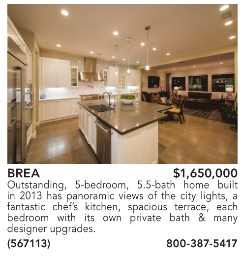 BREA $1,650,000 Outstanding, 5-bedroom, 5.5-bath home built in 2013 has panoramic views of the city lights, a fantastic chef’s kitchen, spacious terrace, each bedroom with its own private bath & many designer upgrades. (567113) 800-387-5417