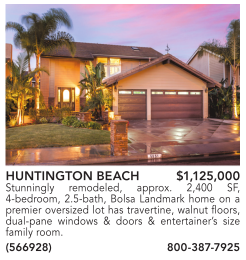 HUNTINGTON BEACH $1,125,000 Stunningly remodeled, approx. 2,400 SF, 4-bedroom, 2.5-bath, Bolsa Landmark home on a premier oversized lot has travertine, walnut floors, dual-pane windows & doors & entertainer’s size family room. (566928) 800-387-7925