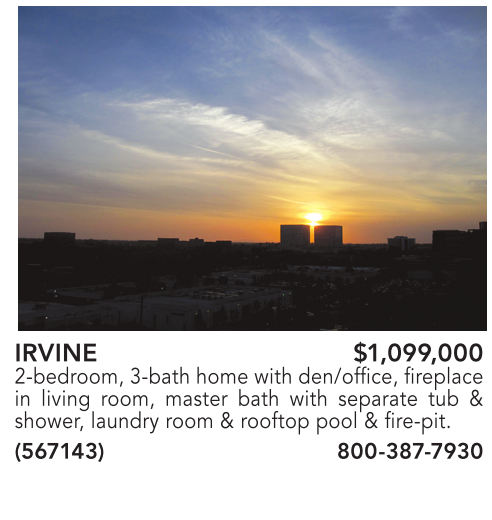 IRVINE $1,099,000 2-bedroom, 3-bath home with den/office, fireplace in living room, master bath with separate tub & shower, laundry room & rooftop pool & fire-pit.