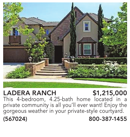 LADERA RANCH $1,215,000 This 4-bedroom, 4.25-bath home located in a private community is all you’ll ever want! Enjoy the gorgeous weather in your private-style courtyard.
